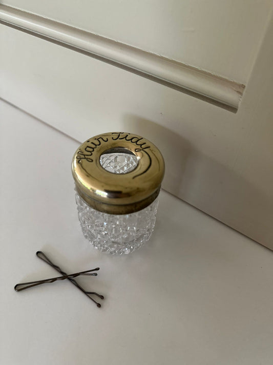 Sold outHair tidy brass & glass pot